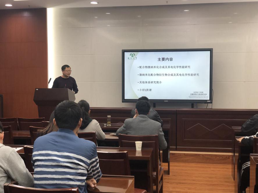 化学系主任朱映光教授主持。报告中夏晖教授对钠离子电池、水系超级电容器和全固态薄膜锂电池进行了重点介绍,引起了老师和同学们的兴趣。报告结束后,夏晖教授为在场师生解答了许多实验中的困惑,师生互动积极,学术气氛热烈。