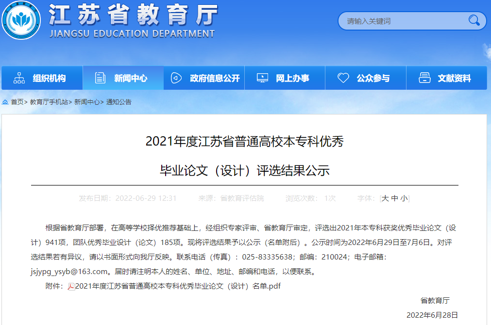 近日,江苏省教育厅公布了2021年度江苏省普通高校本科优秀毕业论文(设计)评选结果,巴黎人赌场