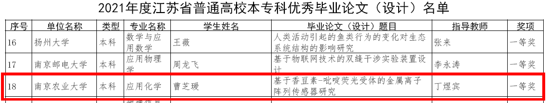 化学系丁煜宾老师指导的2017级应化专业曹芝瑗同学的毕业论文《基于香豆素-吡啶荧光受体的金属离子阵列传感器研究》荣获一等奖。