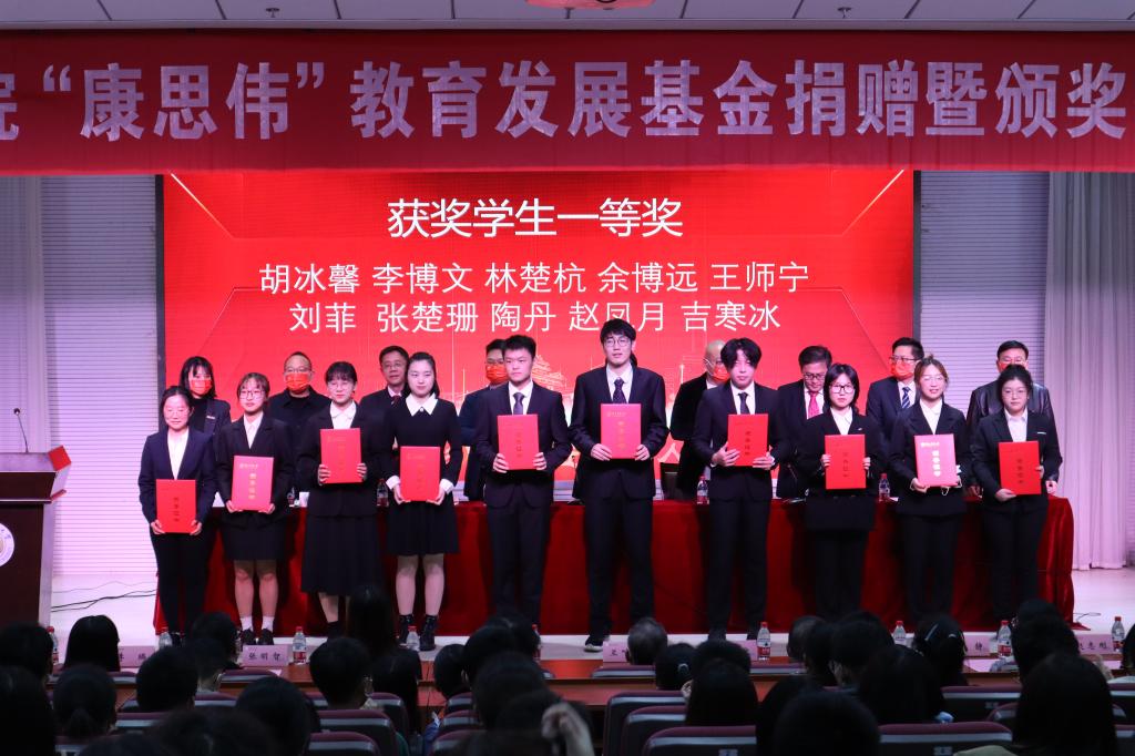 会议第三项议程为宣读2022年度“康思伟”奖教奖学金表彰决定及颁奖仪式,康思伟奖教金获奖教师(10人):陶亚奇、李爱萍、温阳俊、丁煜宾、骈聪、张帆、张明智、杜超、徐凤君、夏青;康思伟奖学金一等奖获奖学生(10人):胡冰馨、李博文、林楚杭、余博远、王师宁、刘菲、张楚姗、陶丹、赵凤月、吉寒冰;康思伟奖学金二等奖获奖学生(10人):李安、赵一凡、沈亚威、周俊鹏、黄文广、胡瑞月、董孟园、孔祥一、马文慧、王艺轩。