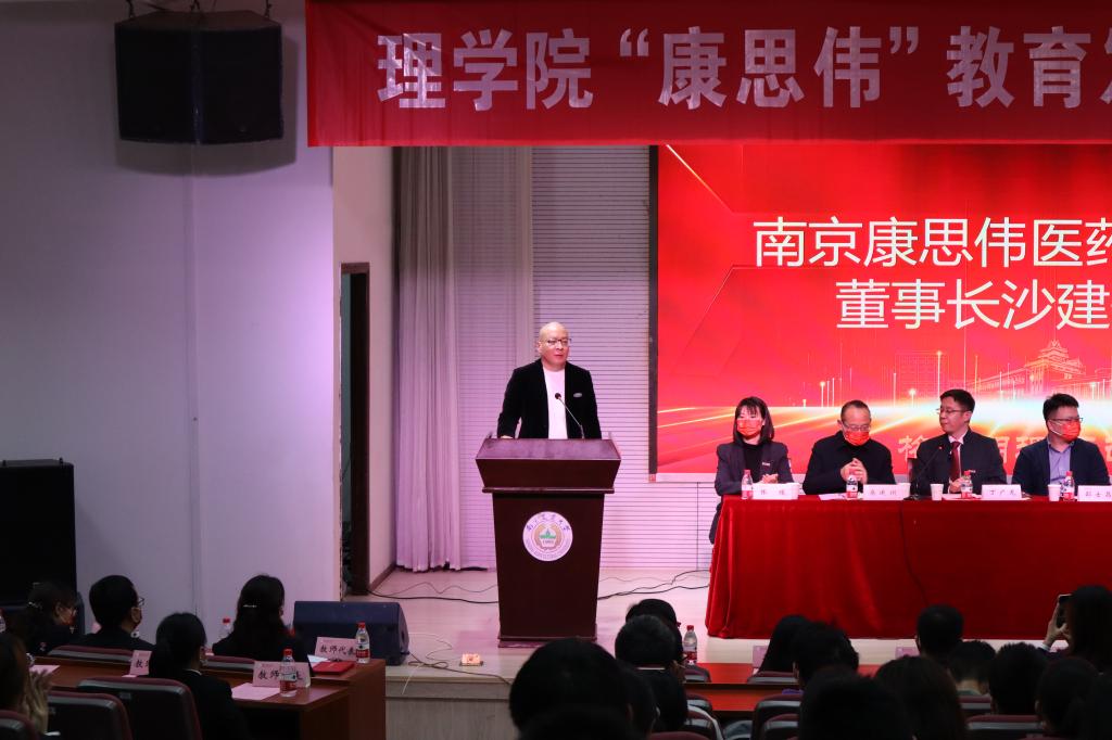 在颁奖仪式结束后,沙建伟董事长作为优秀校友向在座的同学们讲述了自己二十五载的三角人生。南京是梦想的启航,梦想让沙建伟有了无限的力量,而大学生活也让他明白了磨难是前进路上的试金石。深圳让沙建伟懂得感恩,让他厚积而薄发。在深圳,他寻找机会登上更大的舞台,积极参加慈善项目,数不胜数的经历改变了他的人生轨迹。再次回到熟悉的南京,开始了他的创业生涯。沙建伟正带领着他的团队搭建医药大健康平台,为更多国人健康提供解决方案。最后,沙建伟董事长做出报告总结,并对在座理院学子附上寄语:人生是一场旅行,更是一场修行,但人生的意义,就是我们一直在路上。