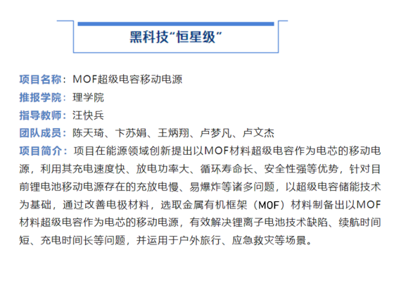 近日,第十八届“挑战杯”江苏省大学生课外学术科技作品竞赛黑科技专项赛事在常州大学落下帷幕。经过激烈的比拼,巴黎人赌场 化学系由汪快兵老师指导,陈天琦、卢文杰等5位学生共同完成的《MOF超级电容移动电源》项目被评定为黑科技专项赛“一等奖”(恒星级)。
