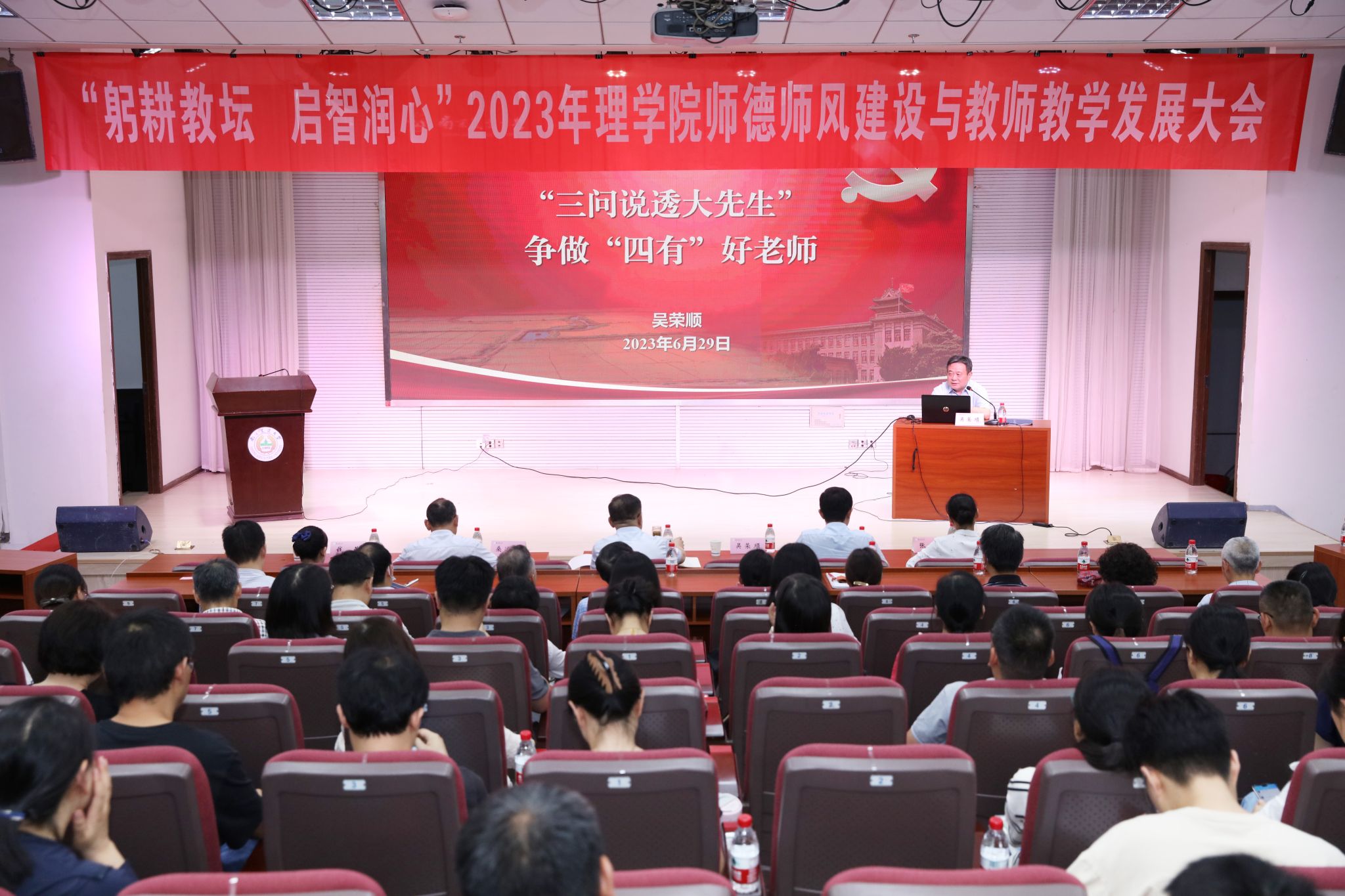 作为承担全校数理化公共基础课教育教学任务的学院,教师的精神风貌和教学质量直接关系到新生大学学习习惯的养成,要不断涵养教师的师德师风,推动主题教育以学正风走深走实,在全校上下营造优良的校风教风学风。吴荣顺以《“三问说透大先生”争做“四有”好老师》为题作了专题辅导报告,领学了习近平总书记关于师德师风的重要指示精神,从“何为大先生”“因何要大先生”“如何做大先生”三个方面展开论述。他用生动的案例和身边人身边事,向大家详细阐释了“大先生”的“大情怀”、“大境界”、“大学问”和“大人格”内涵。他强调,建设高质量教育体系需要“大先生”,建设农业特色世界一流大学更需要源源不断地涌现“大先生”。他希望,老师们要树立“躬耕教坛、强国有我”的志向和抱负,切实提高政治素质,遵守职业道德规范,守好教书育人初心,担负立德树人使命,争做新时代“四有”好老师。