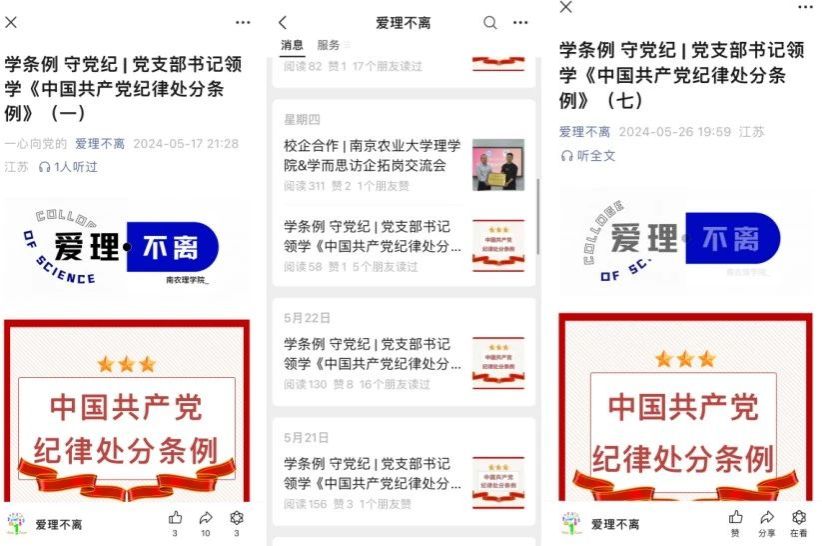 上线下有机结合,丰富学习载体。5月17日至5月26日,学院在网站和爱理不离公众号推出党支部书记领学《中国共产党纪律处分条例》系列推送七期,并及时将每期推送转发至师生群,充分利用好线上微学习平台,营造《条例》学习氛围,做到师生学习全覆盖。