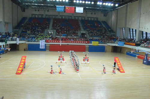 啦啦操队终于在5月27日登上了体育中心的舞台。这是我校第四十三届运动会啦啦操比赛,比赛即将开始,赛前准备工作有条不紊的进行着,评委一一到场,偌大体育中心也是座无虚席。