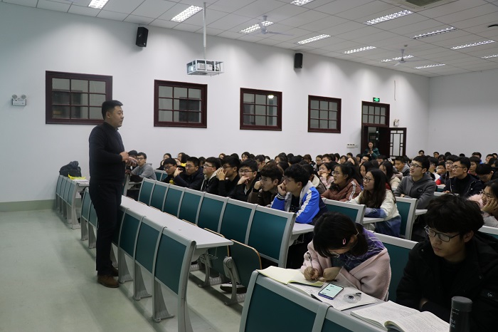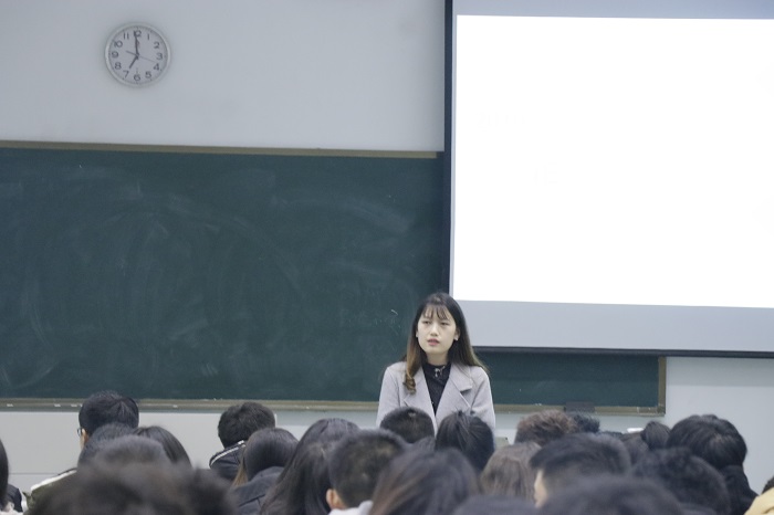辅导员李歆老师首先进行了简要介绍,统计了意向学雅思、托福,以及出国的人数。之后培训机构的老师便对围绕雅思展开了细致的解读;他先介绍了雅思的考试时间,同时对当前雅思的前景作了分析,比如近年学习雅思人数的变化。他指出:一个人学习语言的最佳年龄——19至22岁,即正值大学期间。