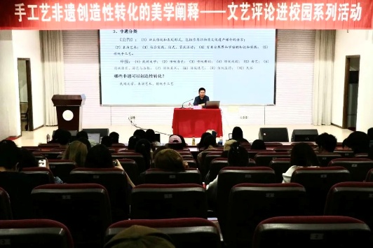 ,特邀东南大学中华民族视觉形象研究基地(国家级智库平台)教授,东南大学人文学院学术委员会副主任、特聘教授、博士研究生导师,江苏省首批紫金文化艺术英才、江苏省“青蓝工程”中青年学术带头人季中扬教授为学生带来《手工艺非遗创造性转化的美学阐释》主题讲座,现场学术氛围浓厚。
