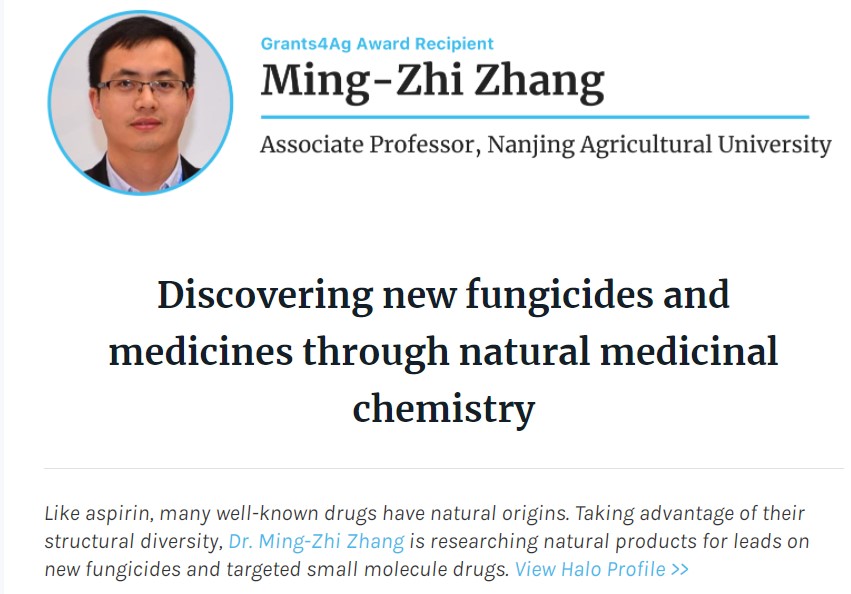 张明智副教授的获奖信息://www.halo.science/blog/discovering-new-fungicides-and-medicines-through-natural-medicinal-chemistry/