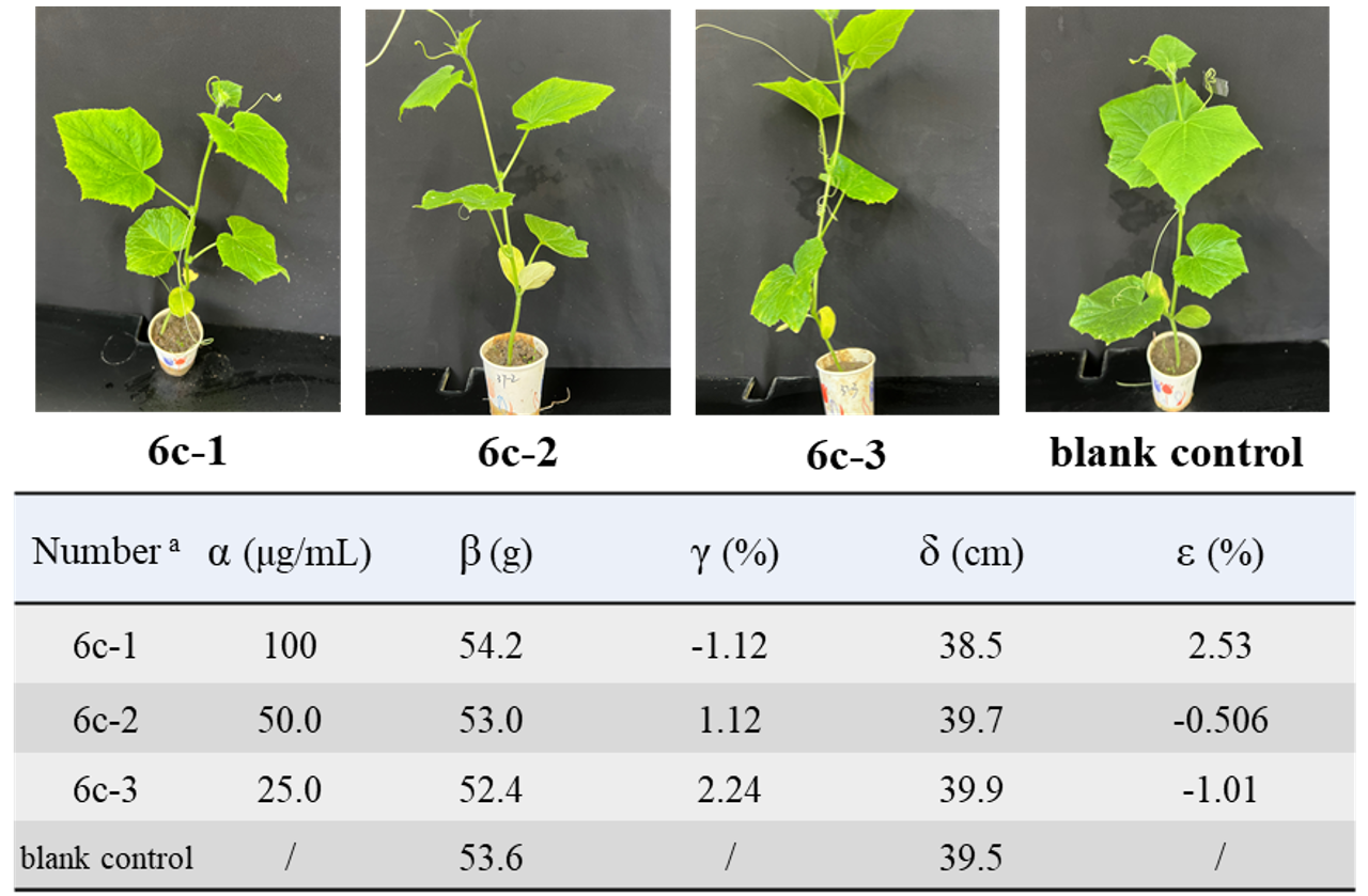 为了评估这些化合物对非靶标植物的影响,研究团队还进行了阴性对照实验。结果显示,化合物6c在不同浓度下对黄瓜的生长没有显著影响,初步证实了其对非感染植物的安全性。研究团队通过分子对接和酶活性测定实验,进一步揭示了高活性化合物对LeuRS和PPO的作用效果和机制。此次研究表明二苯(硫)醚苯并硼唑衍生物具有高杀菌活性、高除草活性、高安全性,是双靶标农药创制的潜在结构。该系列研究在持续推进中。