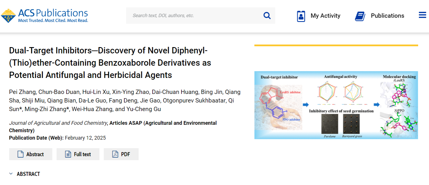 章维华教授和张明智副教授团队在农业综合国际权威期刊《Journal of Agricultural and Food Chemistry》在线发表了题目为“Dual-Target Inhibitors—Discovery of Novel Diphenyl-(Thio)ether Containing Benzoxaborole Derivatives as Potential Antifungal and Herbicidal Agents“的研究论文。