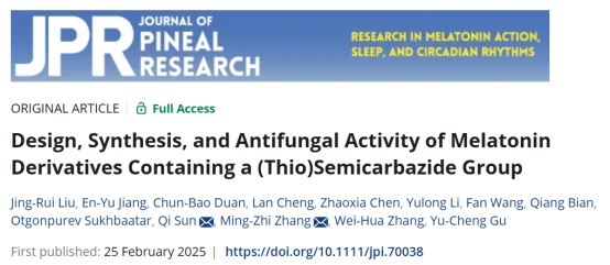 章维华教授和张明智副教授团队在生理学国际权威期刊《Journal of Pineal Research》在线发表了题为“Design, Synthesis, and Antifungal Activity of Melatonin Derivatives Containing a (Thio)Semicarbazide Group”的研究论文,报道了褪黑素衍生物的设计合成及其对常见农业病原真菌的抗真菌活性研究,完成了基于人工智能技术的类农药性预测,并测定了潜在靶标SDH的活性。