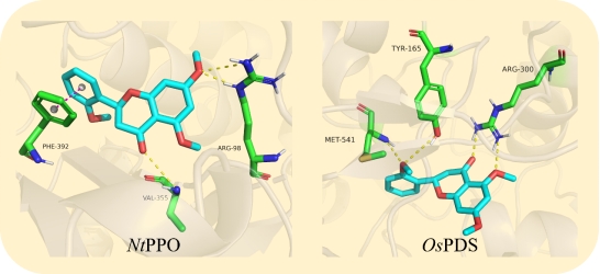 为了探寻其可能的作用机制,我们采用基于人工智能的虚拟筛选技术,最终得到2个潜在的作用靶点。首先,在靶标数据库中筛选出常见的除草剂靶点,得到44个PDB;然后,通过它们的相似性比对,筛除具有相似分子结构和活性空腔位点的同源蛋白,保留具有不同活性位点和空间结构的蛋白,最终得到9个PDB;最后,完成高活性分子与潜在靶标的相互作用分析,通过分子对接和打分排名,通过结合能打分判断其结合情况,筛选出原卟啉原氧化酶(PPO)和八氢番茄红素去饱和酶(PDS)可能是根皮素衍生物除草活性的潜在作用靶点。后续研究工作正在开展中。