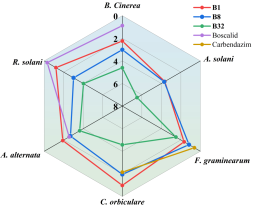 研究团队针对水稻纹枯病(Rhizoctonia solani)、灰霉病(Botrytis cinerea)、炭疽病菌(Colletotrichum orbiculare)等严重威胁农作物生产的真菌病害,通过天然产物模拟与活性亚结构拼接策略,设计并合成了一系列新型香豆素衍生物。实验表明,化合物B1对6种植物病原真菌均表现出广谱抑制能力,尤其对炭疽病菌的EC50低至0.98μg/mL。此外,B1对水稻纹枯病菌、草莓灰霉病菌、小麦赤霉病菌、苹果斑点病菌、番茄早疫病菌的EC50分别为1.20μg/mL、2.24μg/mL、1.67μg/mL、1.90μg/mL、3.65μg/mL,为广谱性抗菌剂的研发提供了新思路。活体实验表明,化合物B1在200μg/mL浓度下对水稻纹枯病菌的防治效果可以达到71.8%,显示出良好的开发应用潜力。